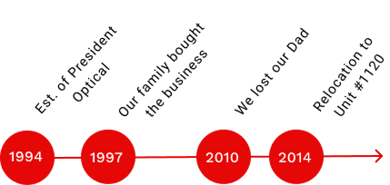 President Optical is a family legacy. In 1997, we immigrated to Canada from Taiwan to carry on a company that was established in 1994. President Optical grounded its roots in President Plaza, the heart of the golden village of Richmond, where many may also recognize as the home of the very first T & T supermarket.